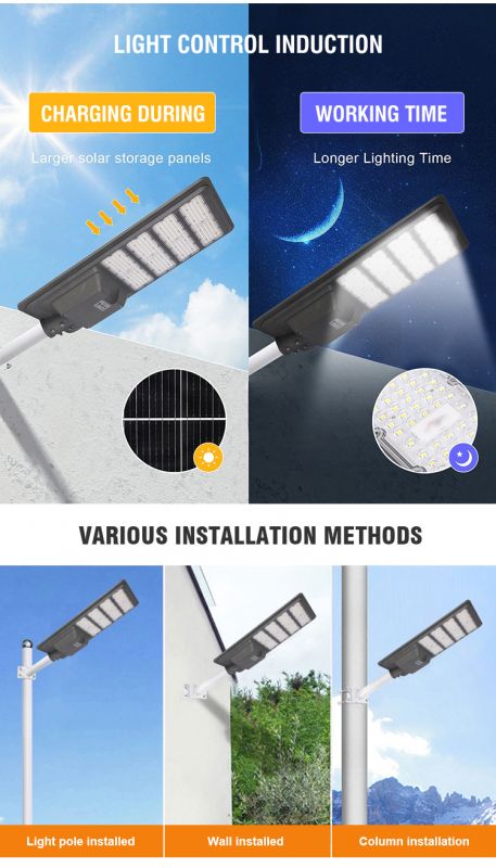 Công suất tấm pin mặt trời/Size: 6V 45W (Silicon đơn tinh thể), 778*340*25mm Chất liệu/kích thước bóng đèn:Nhôm đúc/810*365*87mm Dung lượng Pin: Pin lithium LIFEPO4 3.2V 40AH LED chip: 3030 Led,408/PCS Hiệu suất đèn Luninous: 130LM/W Nhiệt độ màu sắc: 3500K-7500K Tiêu chuẩn chống nước: IP65 Diện tích chiếu sáng: 200㎡ Thời gian sạc Pin: 5-8 giờ (thời tiết bình thường) Thời gian chiếu sáng: 12-15 giờ, 2-3 ngày nồm ẩm. Bảo hành: 2 năm Độ cao lắp đặt: 5-6m Chế độ điều khiển:Điều khiển quang học + Điều khiển từ xa+cảm ứng radar |